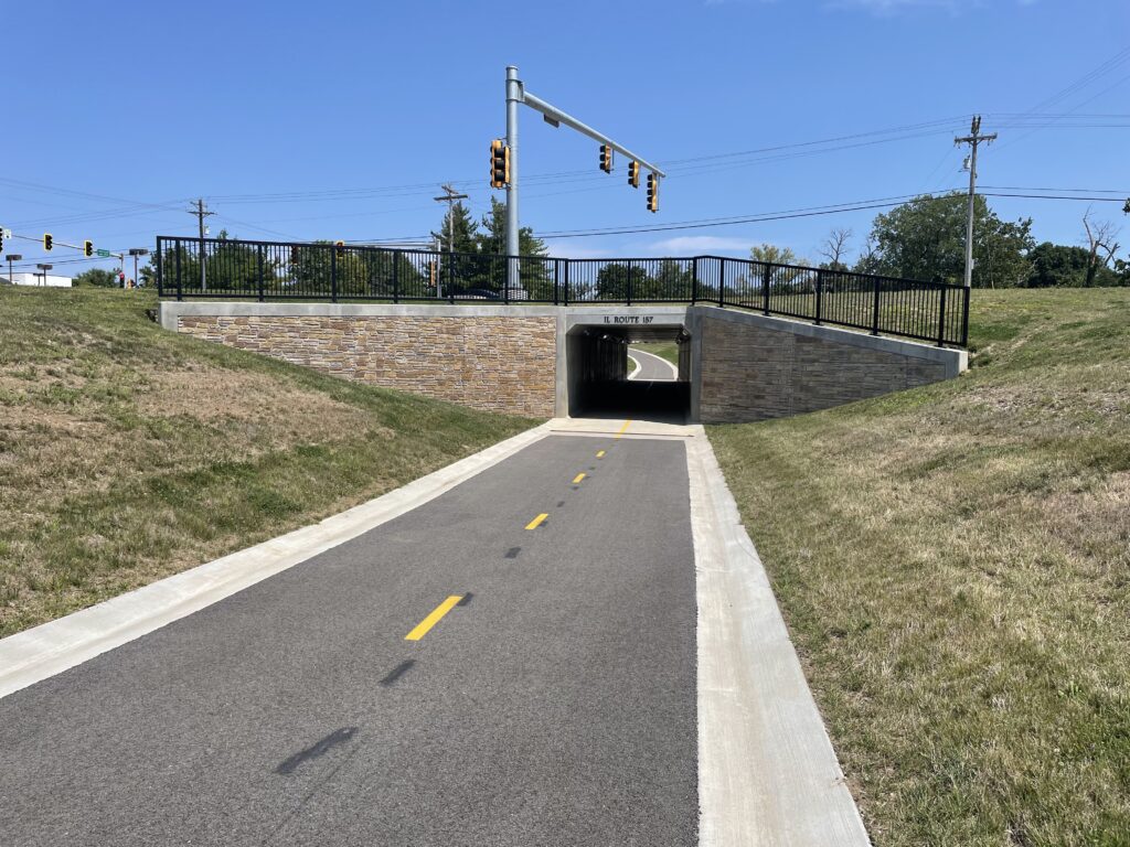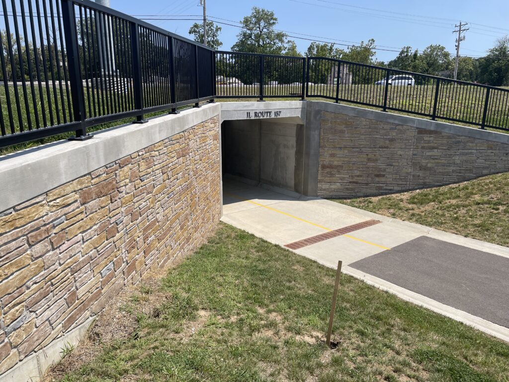 For years, one key safety concern remained. Trail users had to cross Illinois Route 157 at street level. With five lanes of fast-moving traffic, this crossing created a serious hazard for walkers, runners, and cyclists.