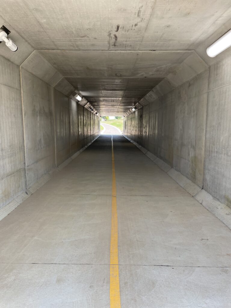 To solve the problem, Madison County Transit partnered with Oates Associates to study options. After reviewing several possibilities, a tunnel was selected for its safety benefits, lower cost, and fit with the natural landscape. The finished project features a 120-foot-long concrete tunnel under Route 157, complete with lighting, cameras, and decorative concrete walls that improve both function and appearance.